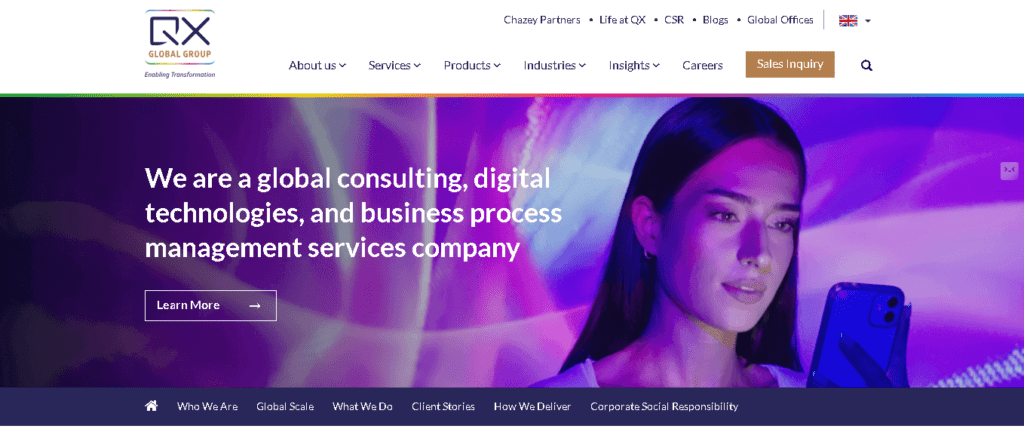 - QX Global Group, a global provider of comprehensive consulting, digital transformation, and business process management services, is based in North Yorkshire, UK. Additionally, the company supports organisations worldwide with its extensive service capabilities. Moreover, with six delivery centres across two countries, it offers a diverse service portfolio that includes offshore, nearshore, and onshore operations.