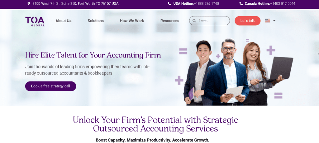 - TOA Global, a Philippines-based company, provides accounting staffing solutions to businesses in Australia, New Zealand, Canada, and the US. Moreover, its specialised teams support firms looking to scale efficiently with offshore talent. Having been in the accounting business for more than ten years, it provides committed client care and is among the biggest employers in the Philippines.