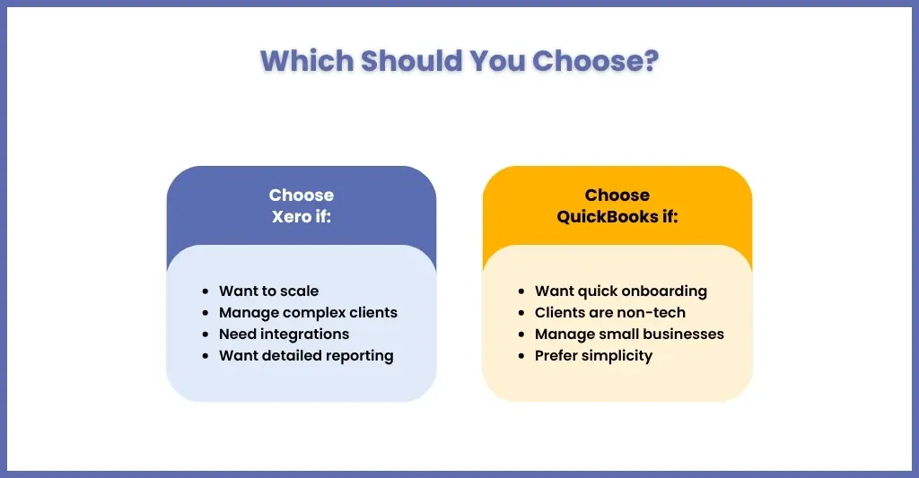Both Xero and QuickBooks are reliable and trusted by most practices across the UK. Xero is ideal for practices that are looking for scale and automation, and QuickBooks is perfect for those who want ease of use and quick onboarding of clients. Choose as per your requirements and the client’s needs.